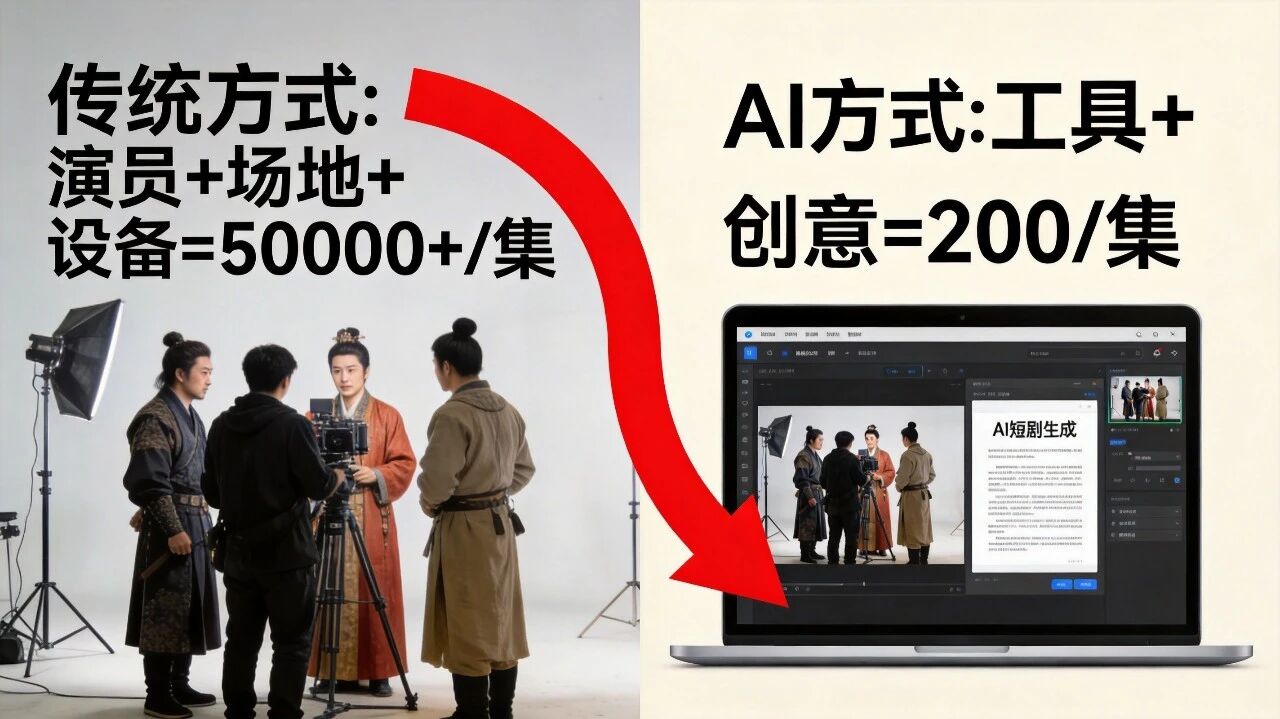 以前拍短剧,光演员片酬、场地租赁、设备投入,一集没个三五万下不来。现在用AI工具,你只需要: